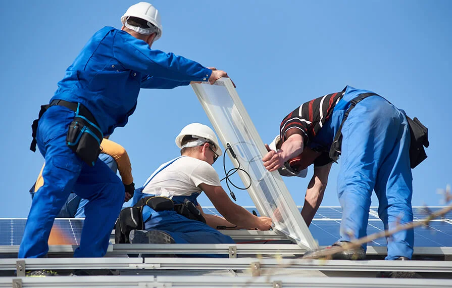 Full shot roofers working together with helmets.